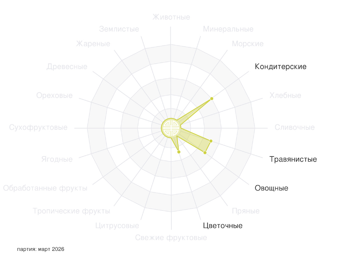 Сухой лист раскрывается мощным, насыщенным букетом полевых цветов, щедро переплетённых с нотами мёда и спелых яблок. В глубине звучат оттенки мелиссы, лаванды и мягких лекарственных трав.