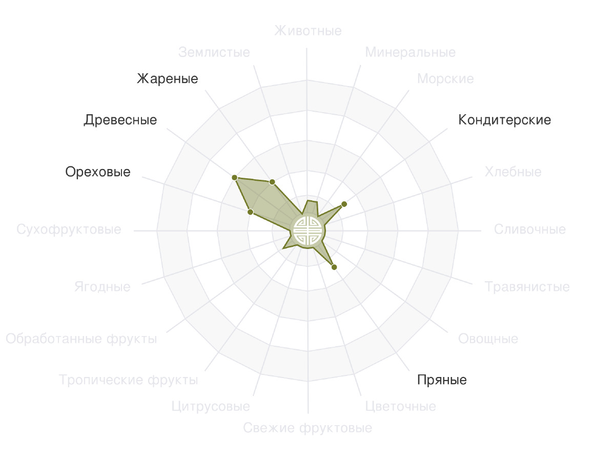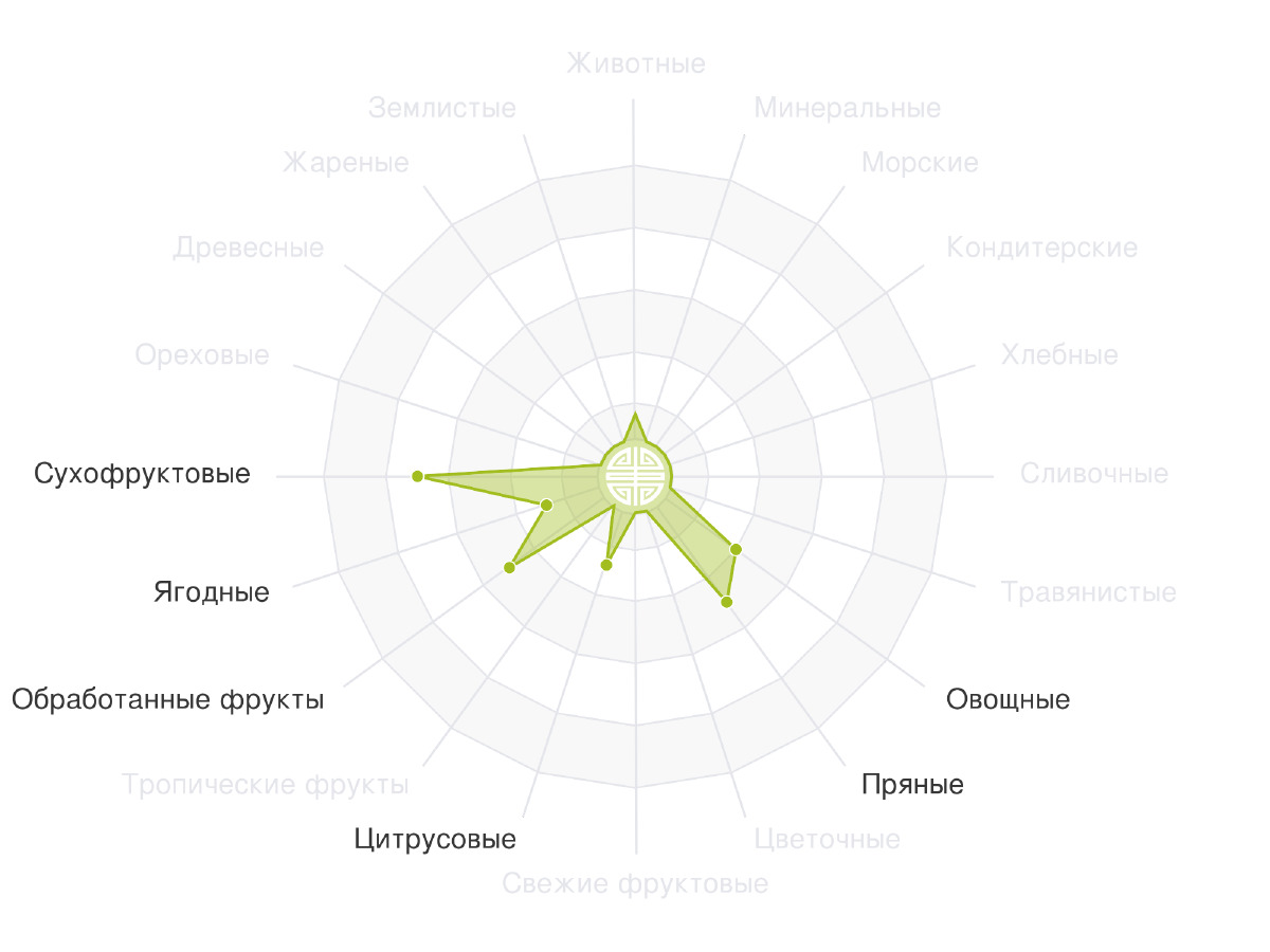 Аромат в гайвани: на крышке – плотный, «питьевой» профиль: мёд, цветы и лекарственные травы. В самой пиале – оттенки ферментированного листа, распаренной коры и едва уловимый фон из кислых яблок.