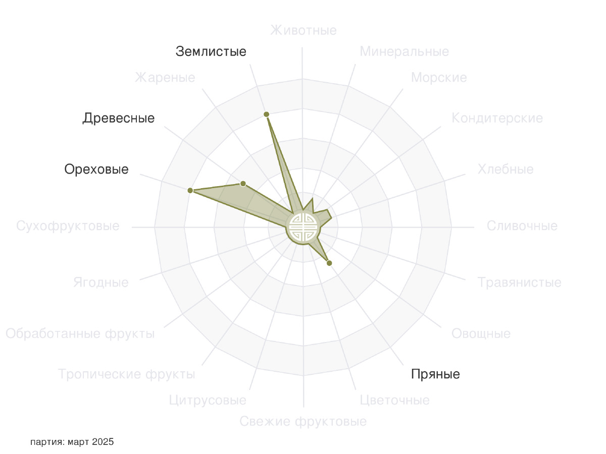 Аромат – исключительно перегородки грецкого ореха, пыльные и ореховые. Вкус стартует со стандартного шу пуэра – пыль, старина, терпкость, землистая минеральность, клетка хомячка с зерновыми "колбасками", аромат соответствует. И только спустя несколько проливов во вкус и аромат возвращается яркий грецкий орех в компании сла