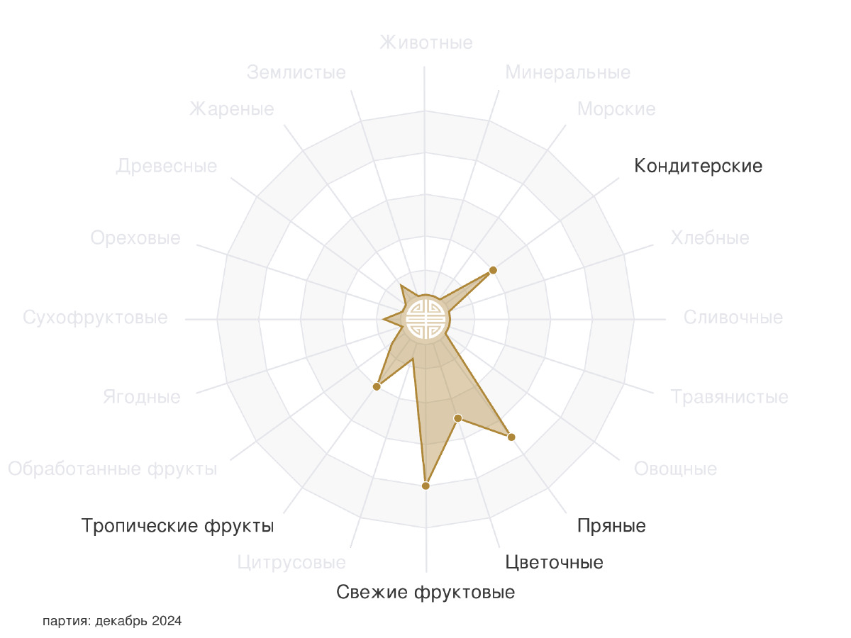 Удивительно красочный и восторженный чай, безусловно, оправдывающий свой прайс. Буквально звучит во рту, переливаясь сочным дюшесом, клементином, фруктовым мармеладом и абрикосовым повидлом.