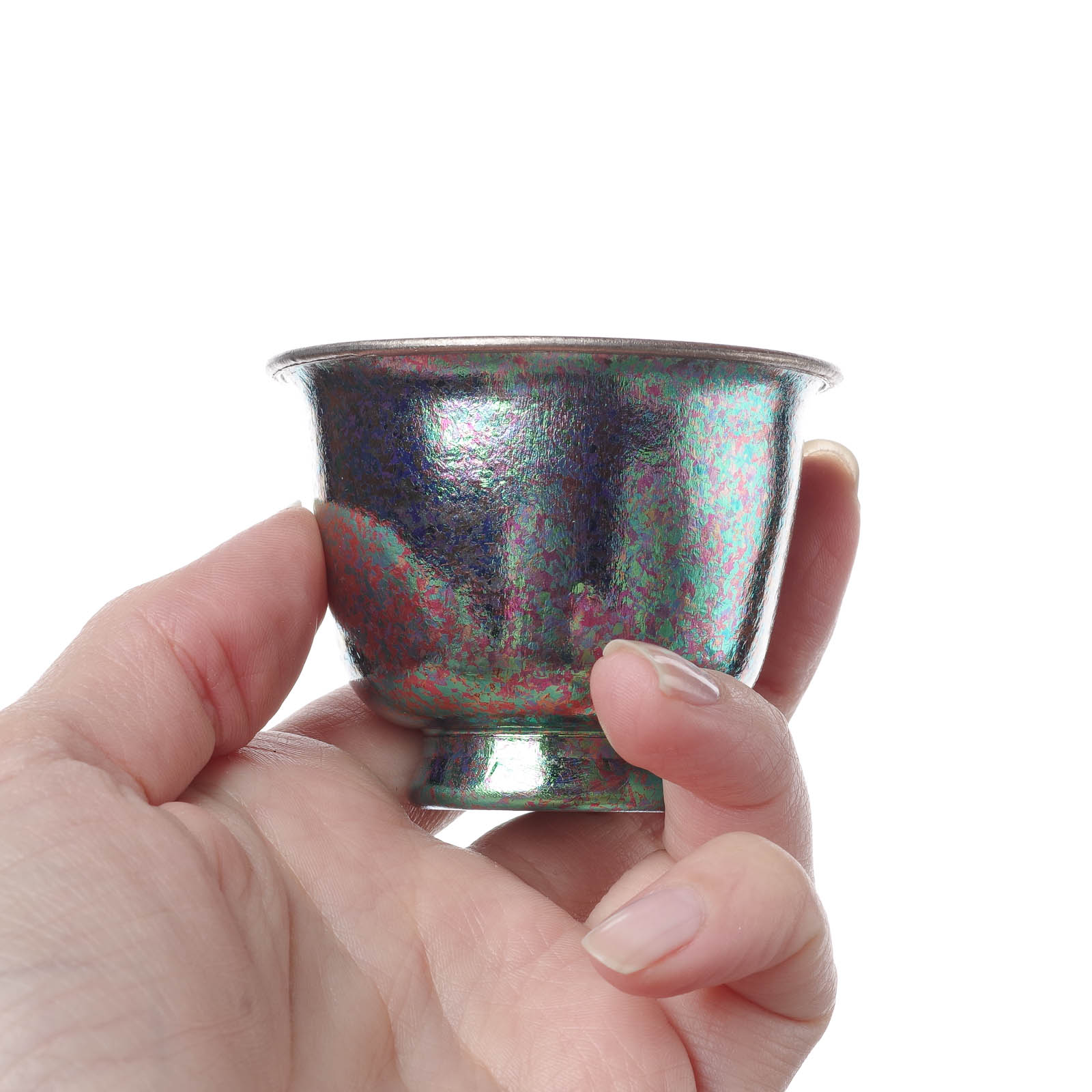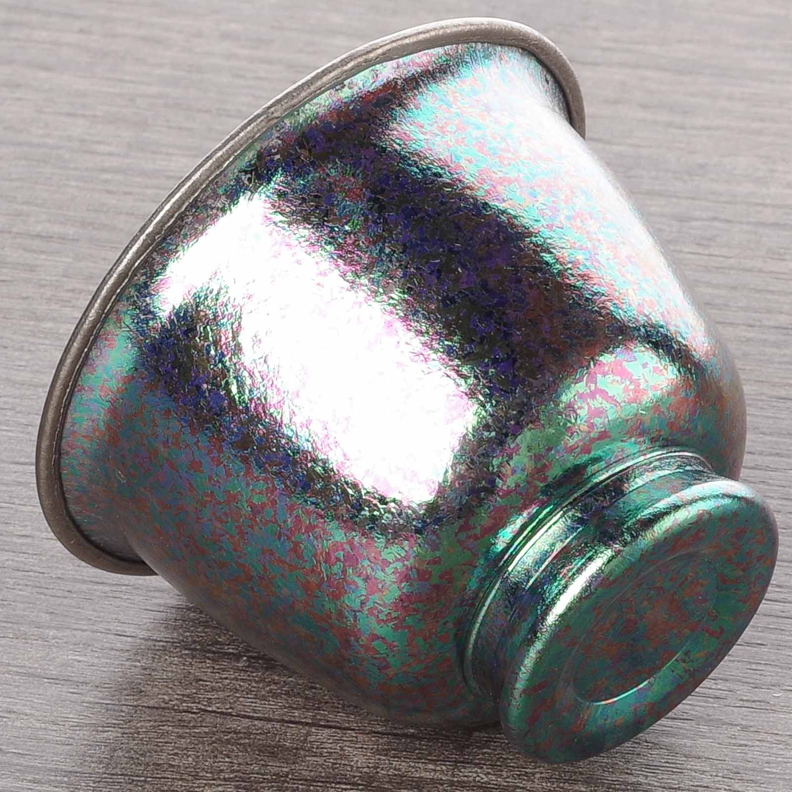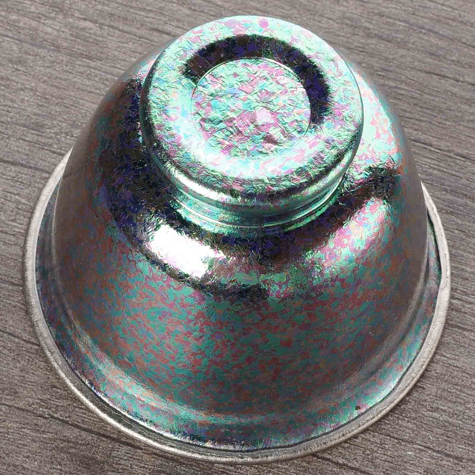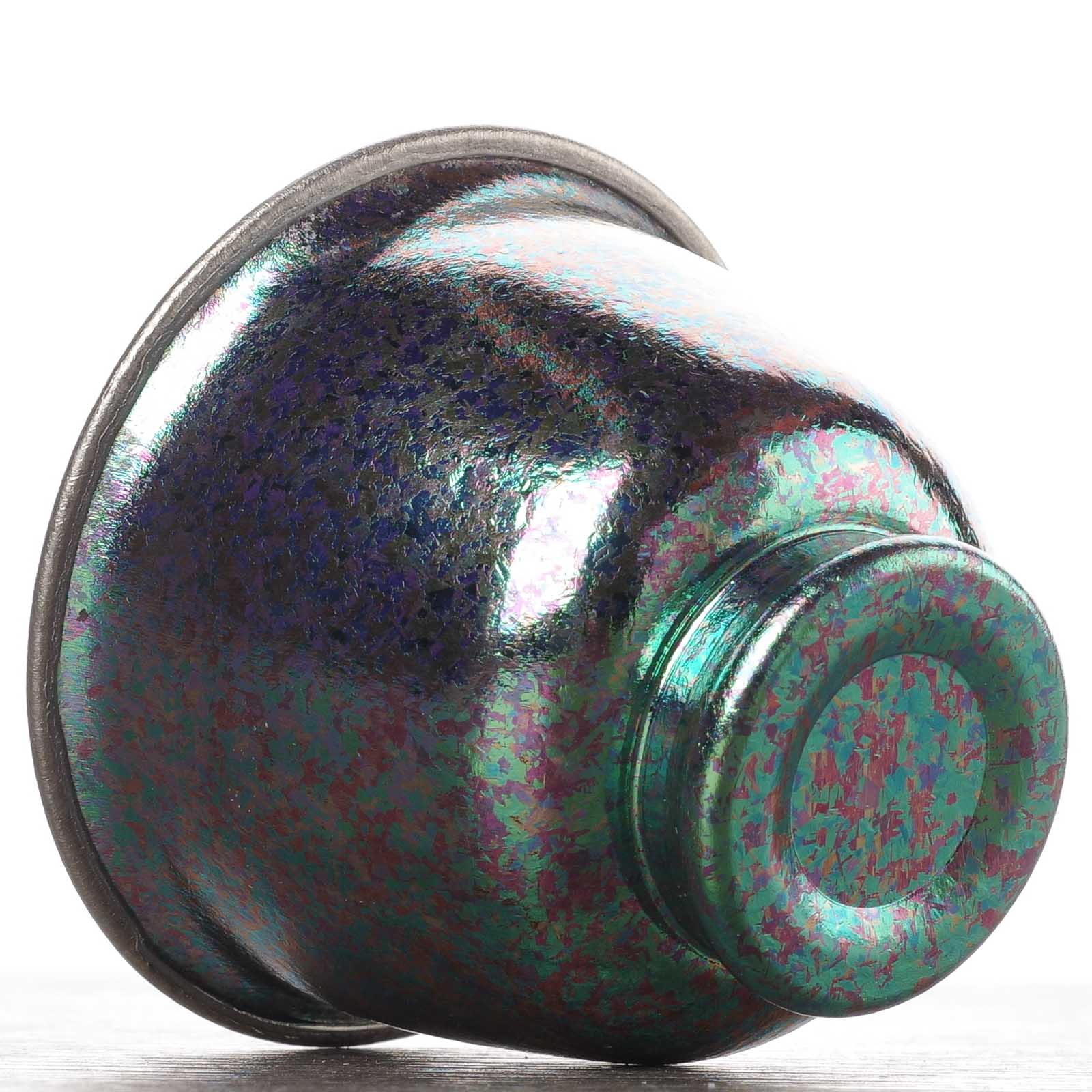 Разный цвет изделий - это не результат окрашивания. Цвет титана полностью зависит от толщины его прозрачной оксидной плёнки: при естественной толщине около 5–10 нанометров металл остаётся стально-серым с лёгким голубоватым оттенком; при нагреве до 300–350 °C плёнка утолщается, и появляется соломенный или золотистый цвет; при 400–450 °C — фиолетовый и пурпурный; при 500 °C — синий и голубой; при дальнейшем утолщении — бирюзовый, зелёный и розовый. Все эти оттенки возникают не от краски, а от интерференции света — поэтому каждый титановый предмет, будь то пиала или чайница, уникален по своему живому переливу и никогда не тускнеет.