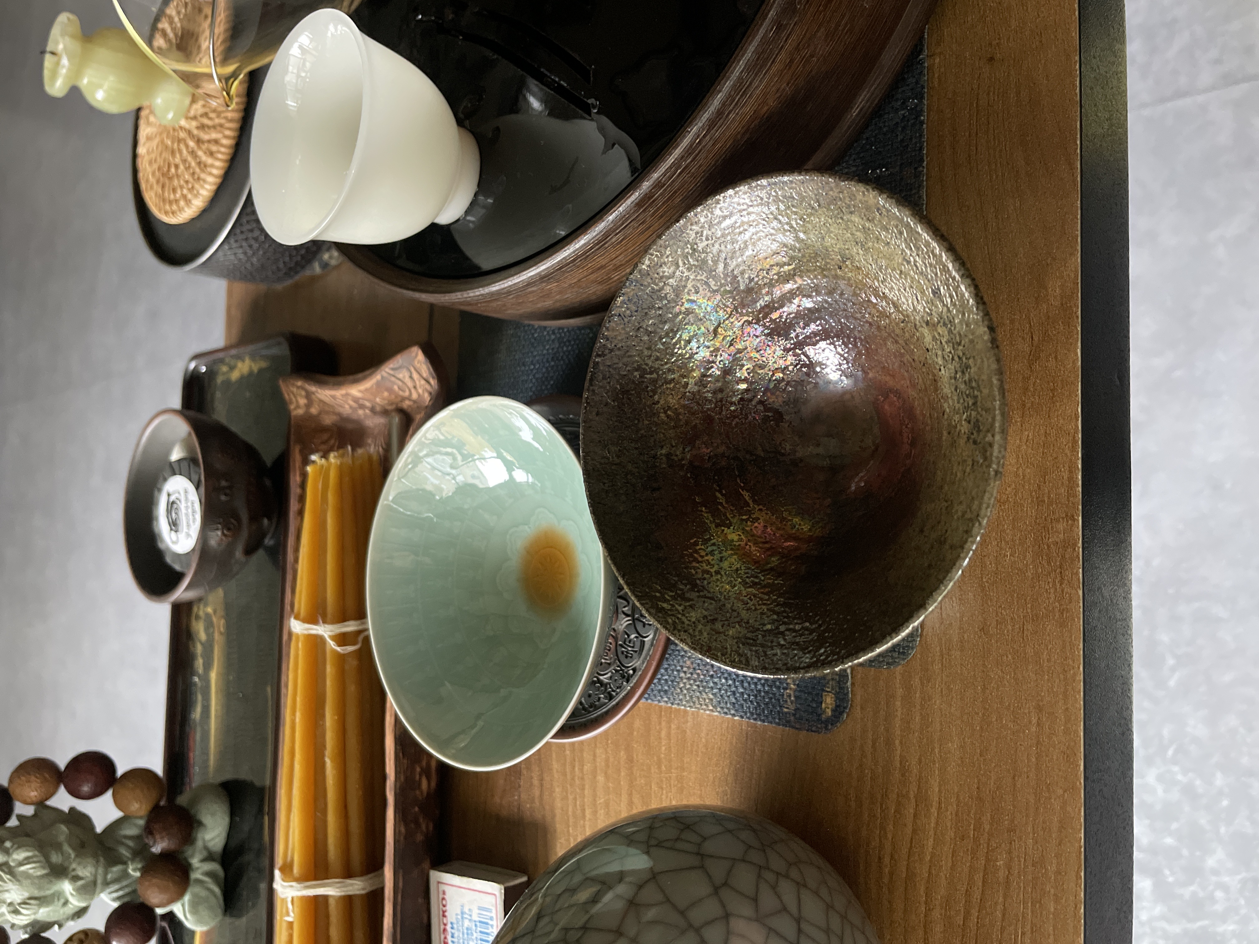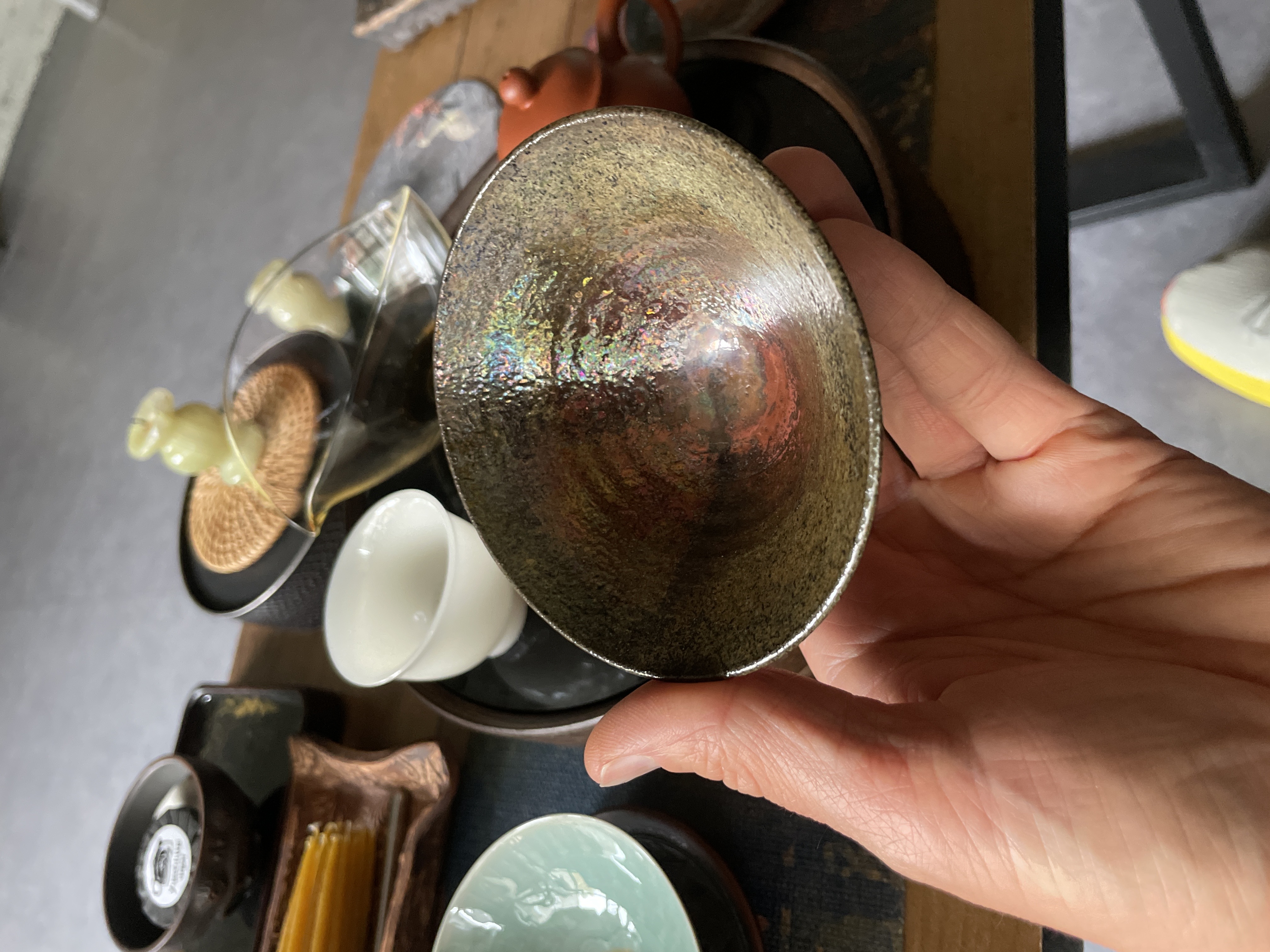 Над этими пиалами специальной серии Чэнь Жэньхуэй работал с июня 2025 года. Он сумел создать высокотемпературную глазурь, которая переливается от серых тонов до радужного сияния, напоминая о дровяном обжиге, но без древесного топлива;