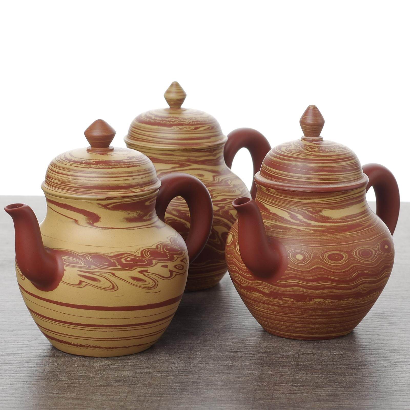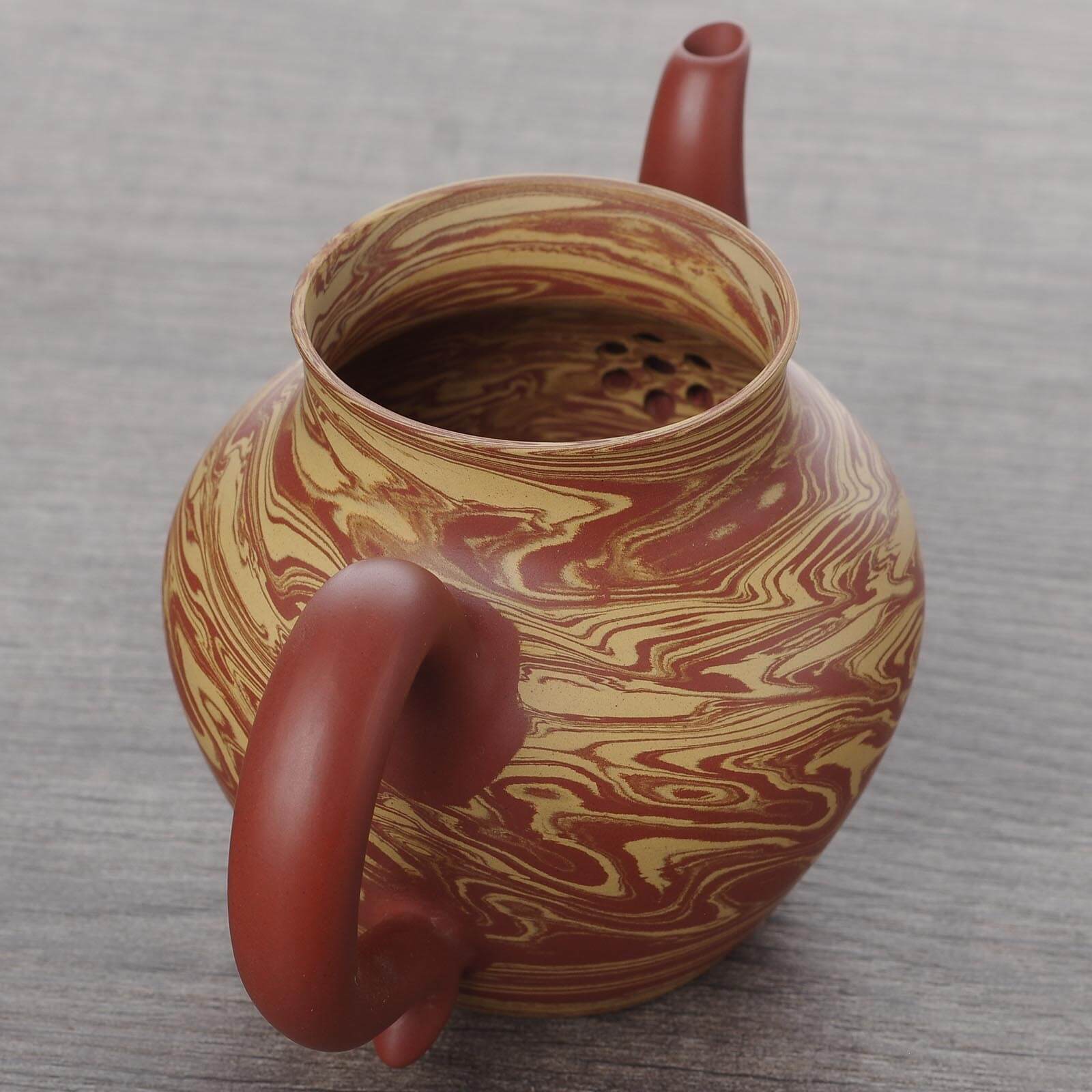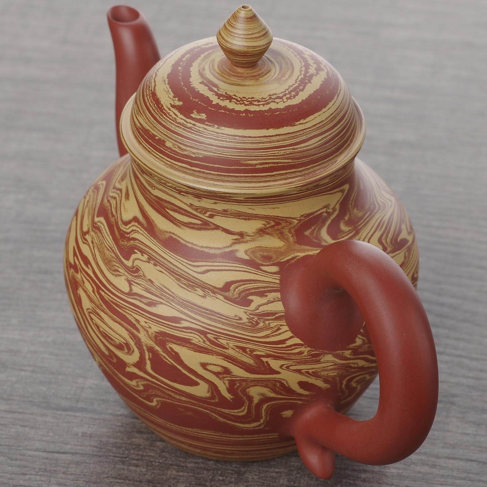 Помимо филигранной работы с классическими формами, Чжан Шаочунь является автором и единственным мастером, работающим в особой технике сплетенной глины, когда на круглом в сечении тельце создаются повторяемые узоры, похожие на вихри в кольцах Сатурна. Остальные мастера делают простые обычные сплетеные чайники или популярные резанные, где узор создается путем срезания глины.