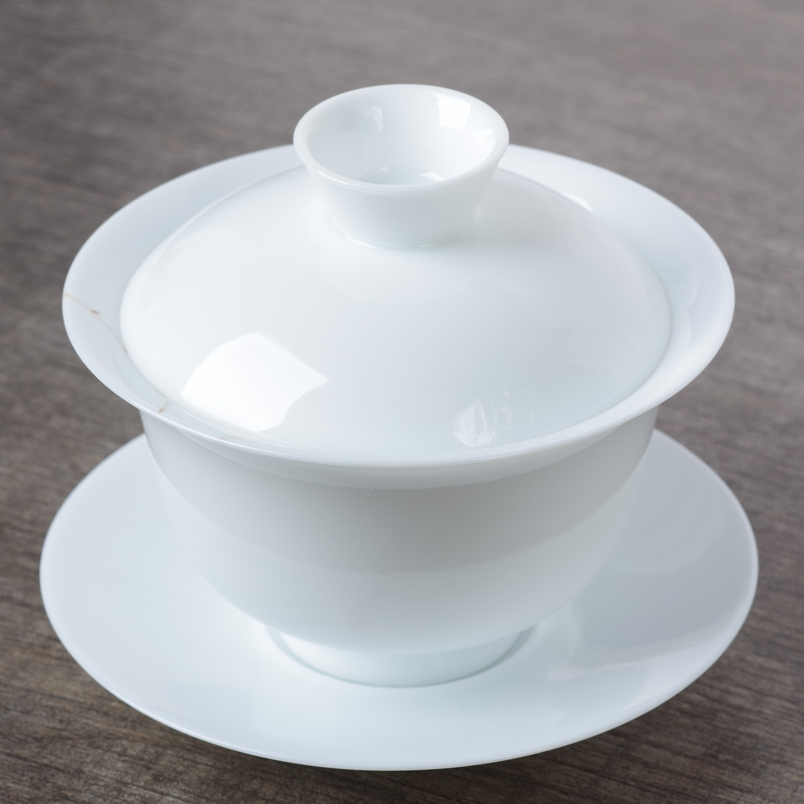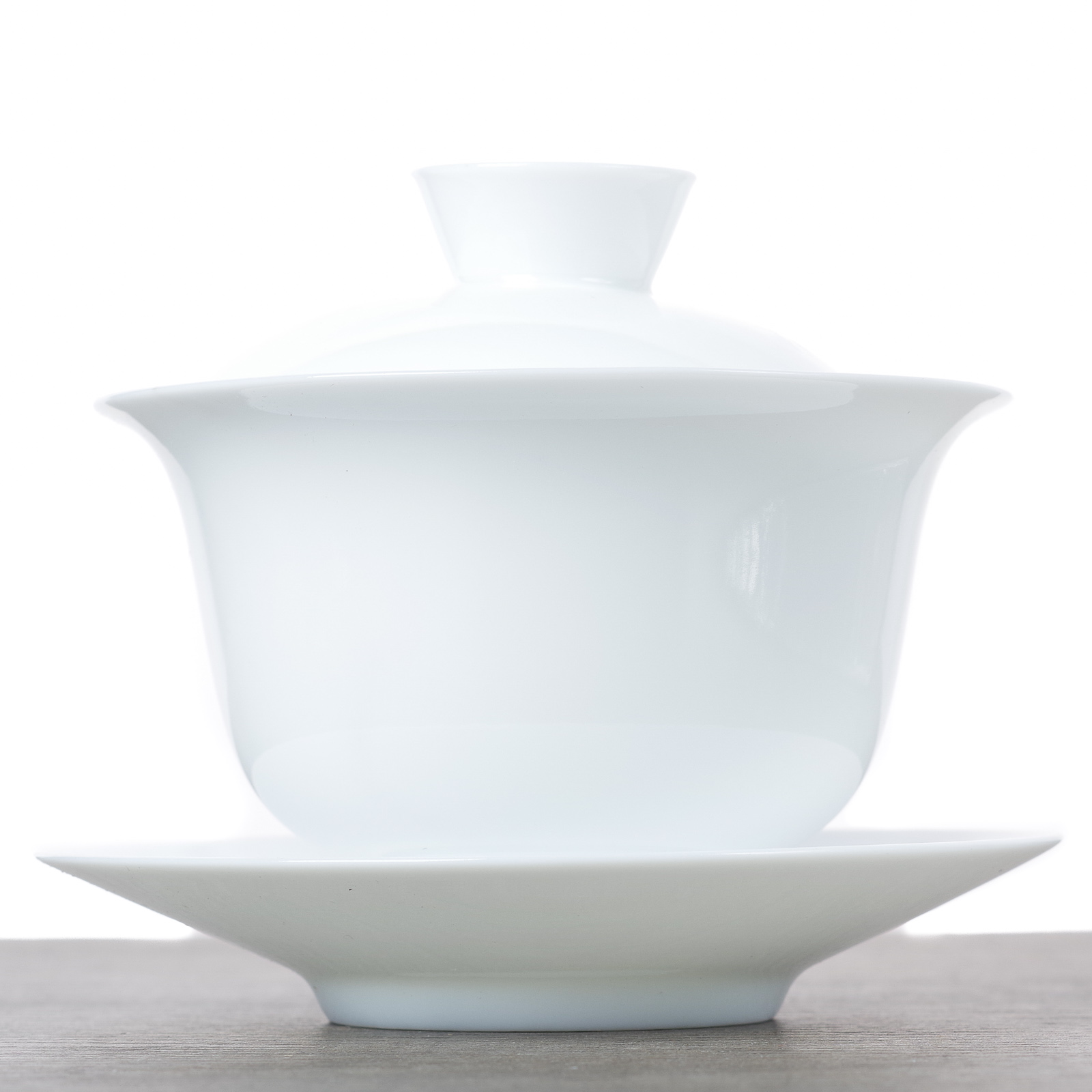 Эта гайвань high end класса по части материала. Равномерная по толщине стенка из тончайшего бинъюй фарфора и с лучшей с точки зрения расскрытия аромата глазурью тяньбайюй. Гайвань буквально прозрачная.