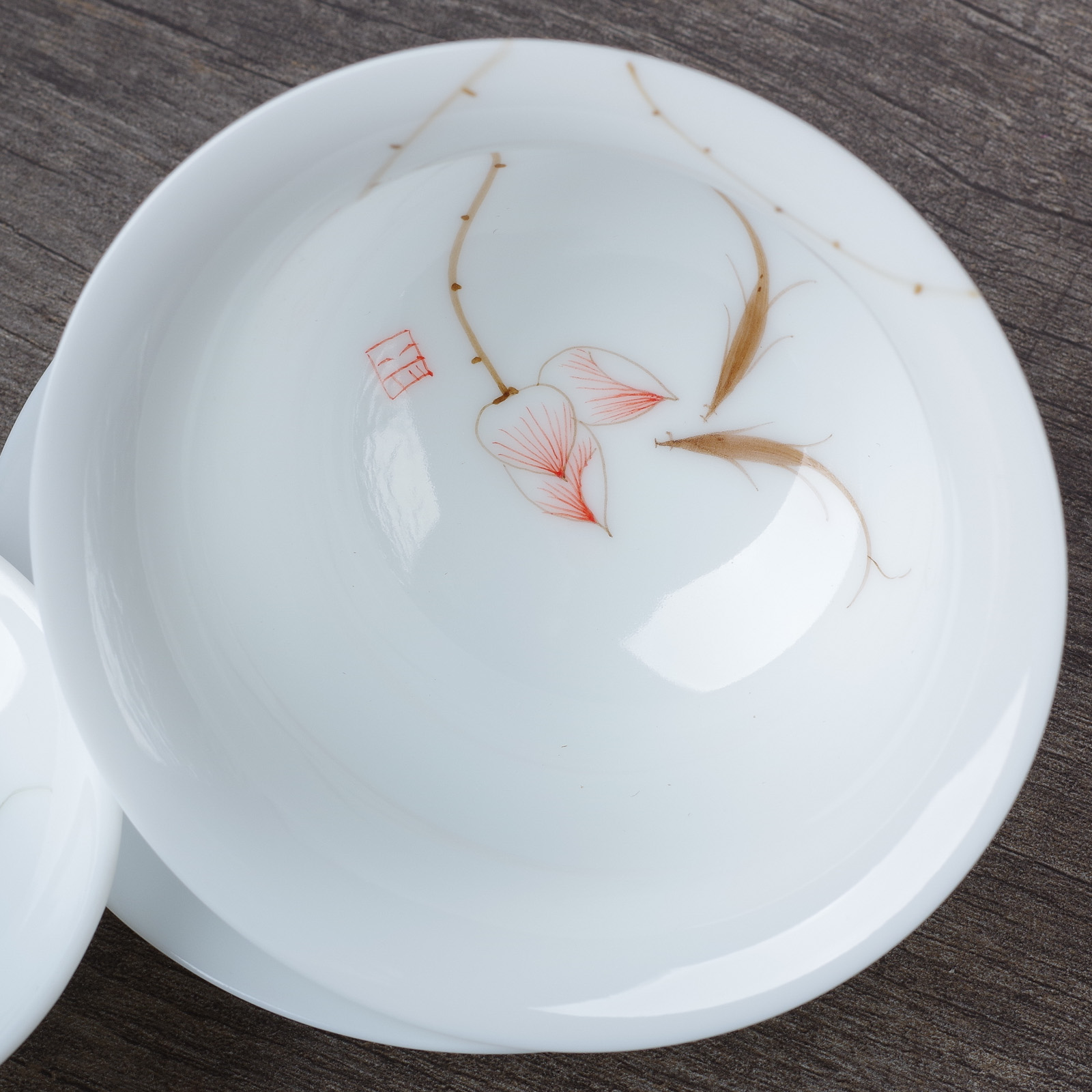 Название вольное. Роспись на внутренних поверхностях. Лотосы не видны окружающим, но видны тому, кто поднимает крышку, чтобы послушать с нее шлейф аромата. Ощущение чая - внутреннее переживание, это быть, а не казаться. И роспись, эта красота внутри, как нельзя кстати подчеркивает такой принцип.