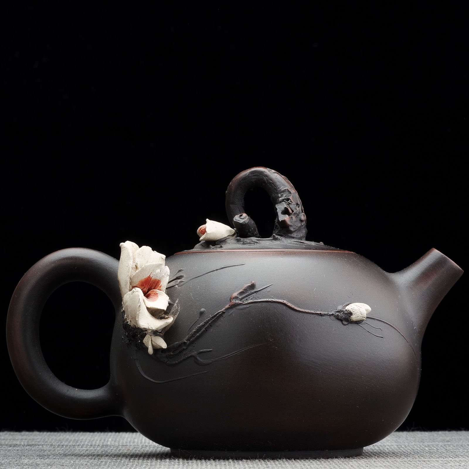 Мастер 马琳 Ма Линь. Эта женщина делает предметы, вдохновляясь красотой юньнанской природы. Она украшает свои чайники фотореалистичными цветами, веточками, плодами фруктов и так далее. Особенность её изделий и сосудов для заваривания чая - невероятный объем;