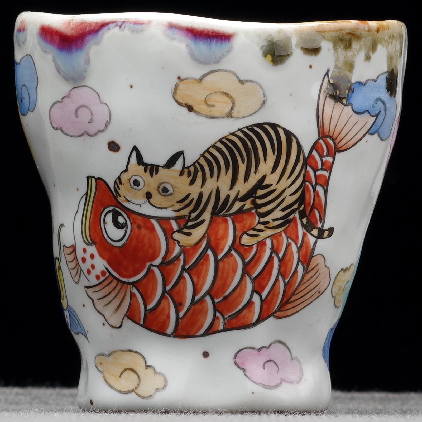Пиала 75мл "Котик на рыбе Ароване", керамика из Цзиндечжень, Цзе Чжицзюнь (403613)