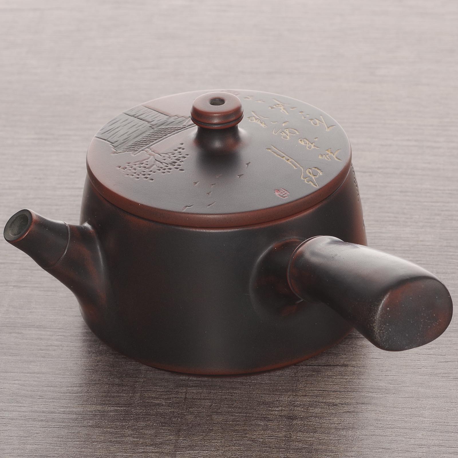 Чайник стиля "Кюсю" имеет боковую ручку. Удобный хват осуществляется между указательным и безымянным пальцами с фиксацией крышки большим пальцем;