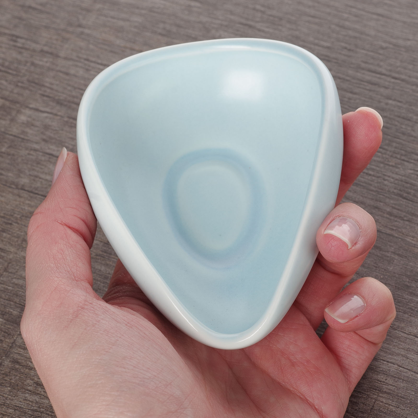 Чахэ выполнена из фарфора. Удобно ложится в ладонь. Ничего лишнего, ведь в центре — чай. Края имеют плавный переход, чай будет легко высыпаться в чайник или гайвань.
