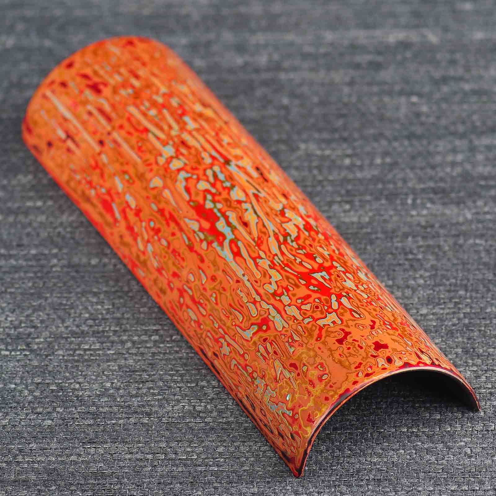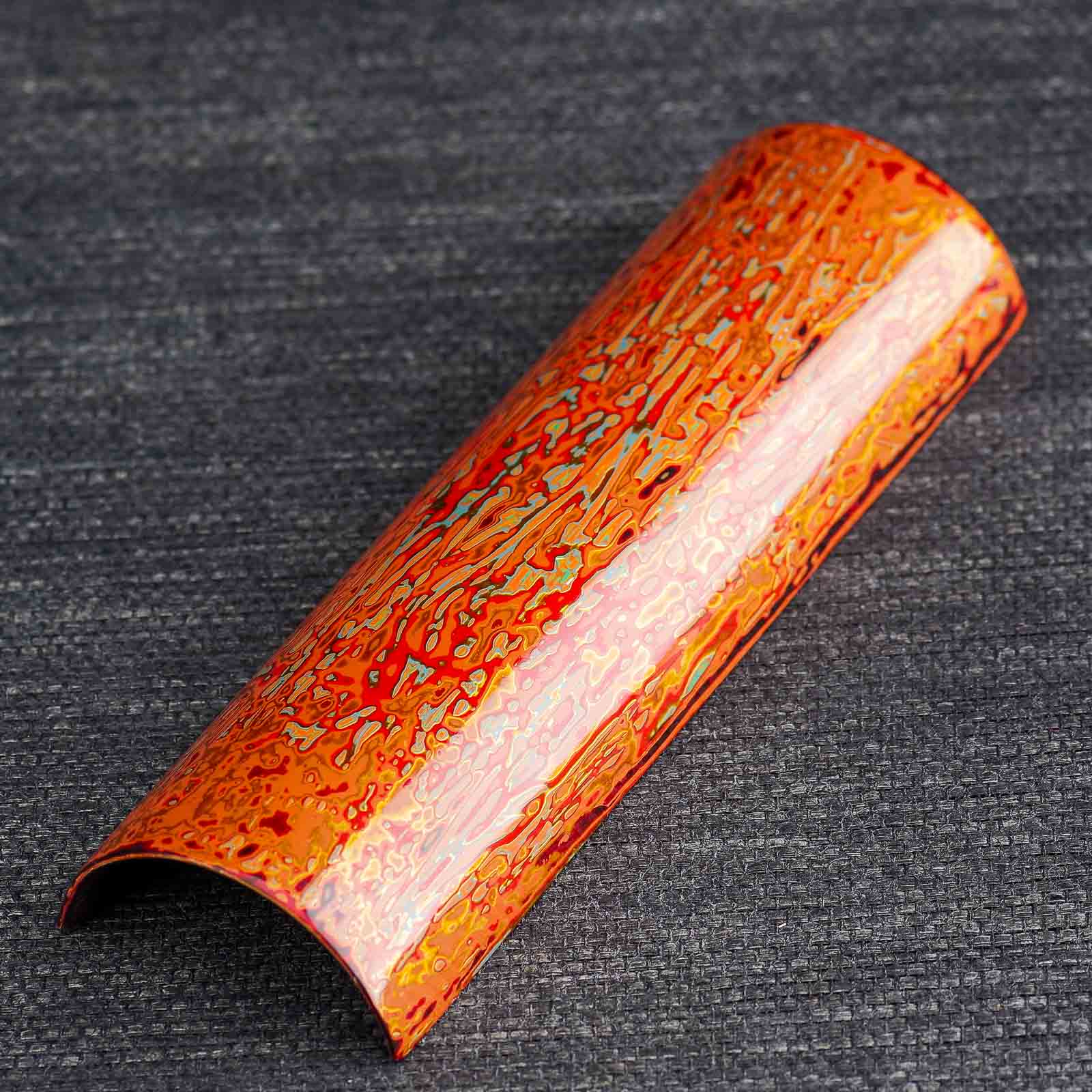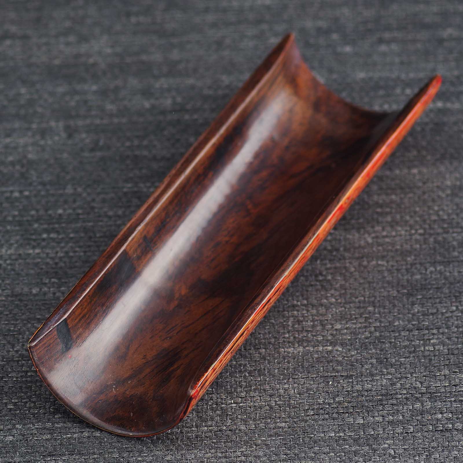 Невероятной красоты, глубины и мастерского исполнения роспись смолой лакового дерева. Природный сок лакового дерева, будучи очень токсичным аллергеном в сыром виде, после полимеризации становится абсолютно инертным и безопасным при контакте с пищей, и даже с кипятком (Техника реставрирования кинцуги производится именно этой смолой). С помощью базового сырого и пигментированных лаков создается объем и глубина на плоских поверхностях. В качестве основы под роспись использовался деревянный желобок.