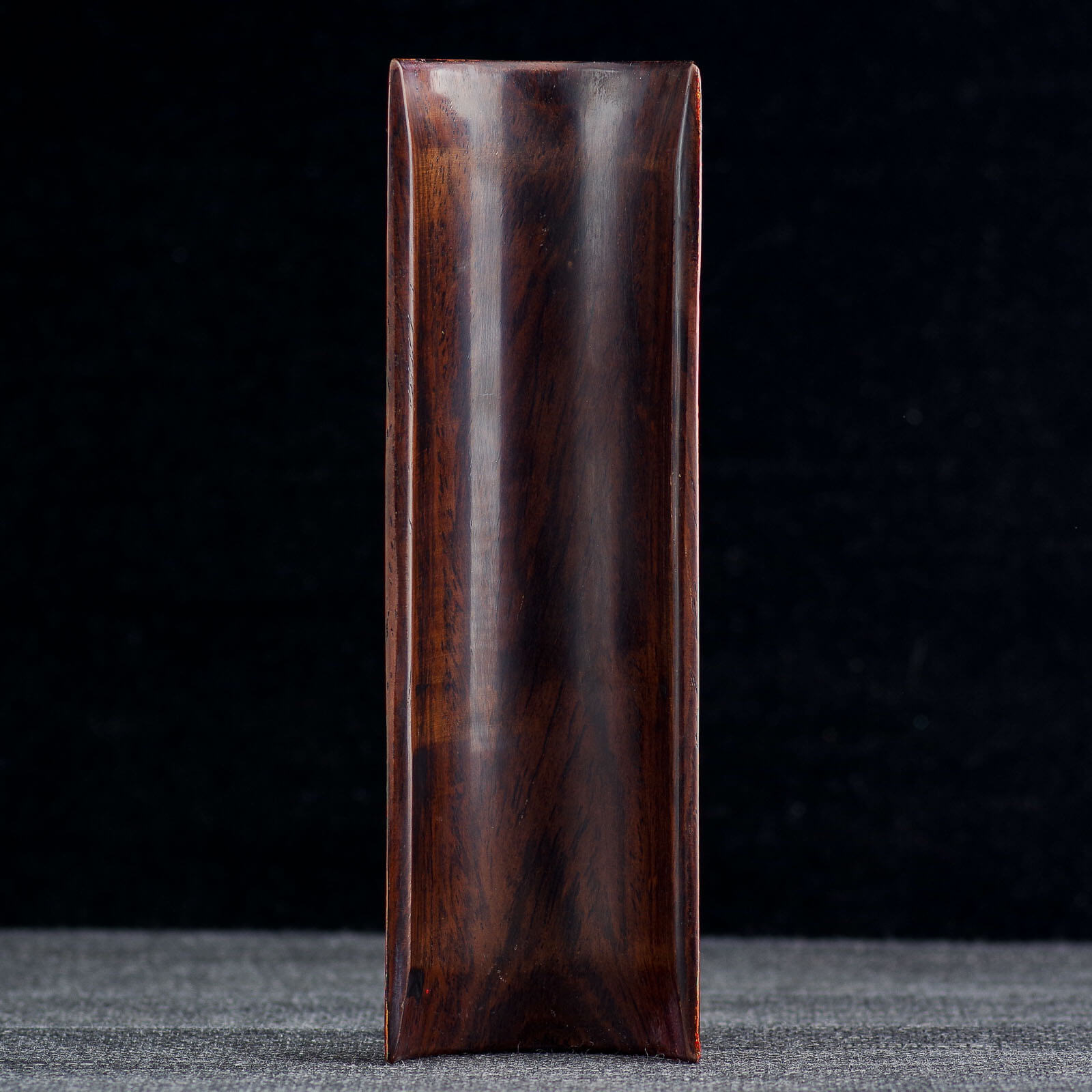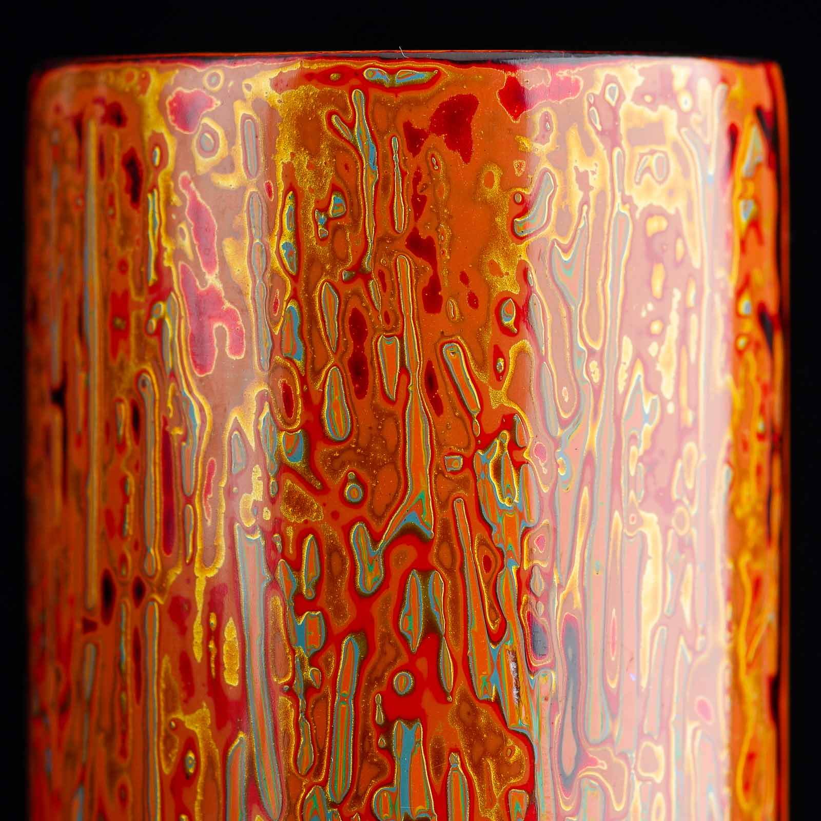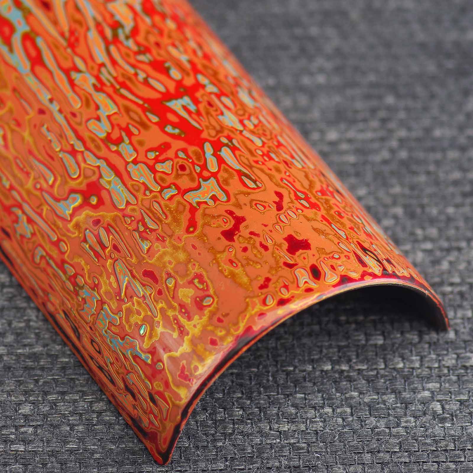 Невероятной красоты, глубины и мастерского исполнения роспись смолой лакового дерева. Природный сок лакового дерева, будучи очень токсичным аллергеном в сыром виде, после полимеризации становится абсолютно инертным и безопасным при контакте с пищей, и даже с кипятком (Техника реставрирования кинцуги производится именно этой смолой). С помощью базового сырого и пигментированных лаков создается объем и глубина на плоских поверхностях. В качестве основы под роспись использовался деревянный желобок.