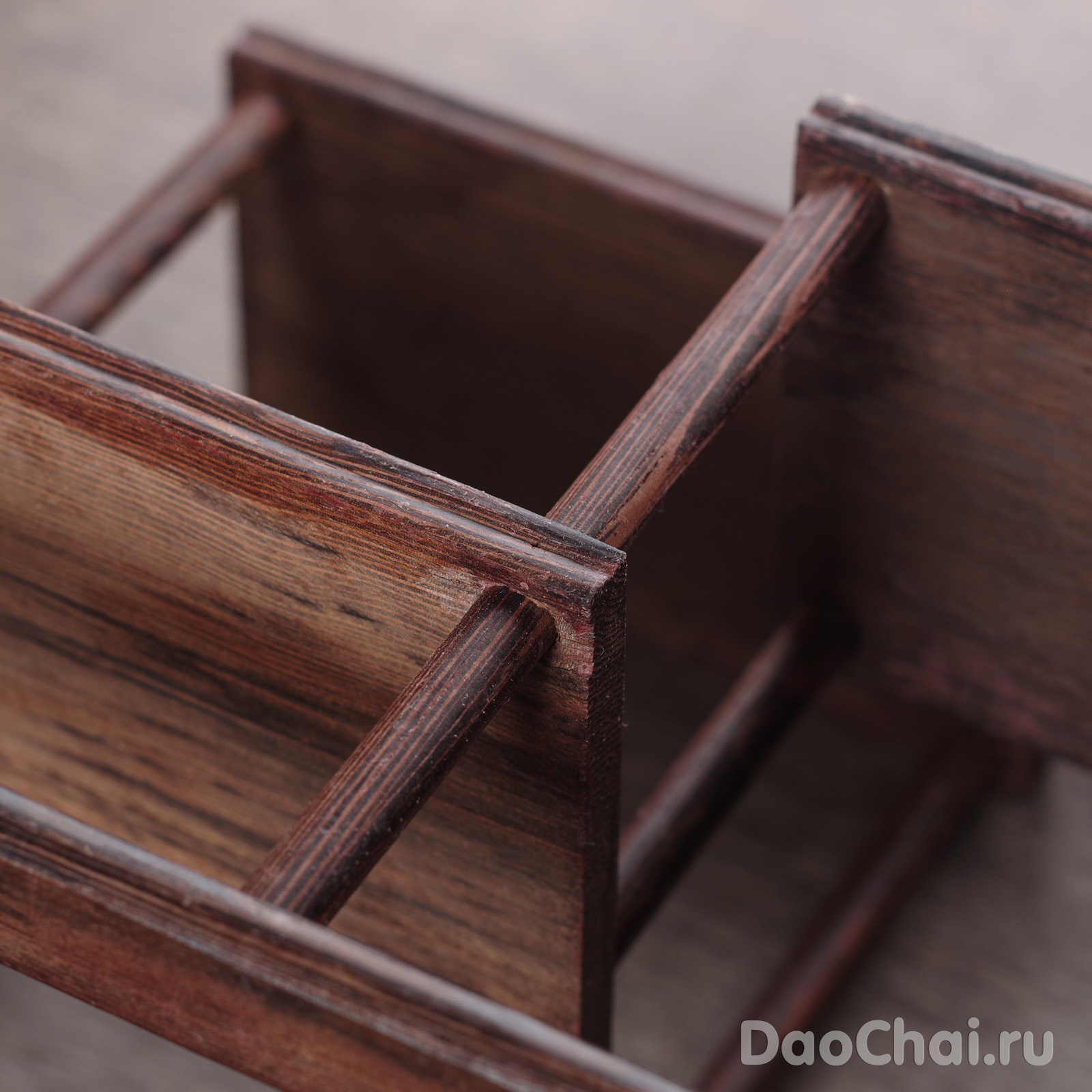 Выполнена из тонких щитов древесины венге «куриное крыло». Собрана с помощью шпилек и клея. По обработке поверхности смотрите детальные снимки выше, на фото взята произвольная полка, показаны максимально возможные недочеты, к которым могут возникнуть вопросы: места смыкания элементов, следы от шпилек, шлифовка поверхности.