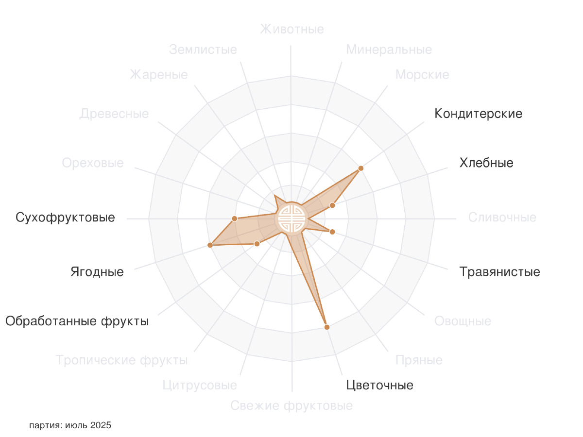 В этом году (в 2025) их Фэнцин мы привезли сразу три разных грейда "китайского красного". Этот является самым доступным, но невероятно прекрасным по вкусоароматике. В сухом листе с высоким узнаваемым для "китайского красного" ароматом. При более внимательном знакомстве доминирует сухофруктовая группа из изюма, чернослива, компот из них и пышные цветы флокса. В прогретой посуде сохраняет эти доминанты, добавляя компот из ежевики и черноплодной рябины, темный гречишный мёд. После обдавания кипятком - варенье и компот из черноплодки, цветочная и ягодная серединка, медовый бисквит и легкий дымок на фоне. Настой ароматный, цветочный, с сахарностью инжира. Вкус сладкий и объемный, с узнаваемой мелодией с цветочно-медовым и чуть травянистым послевкусием.