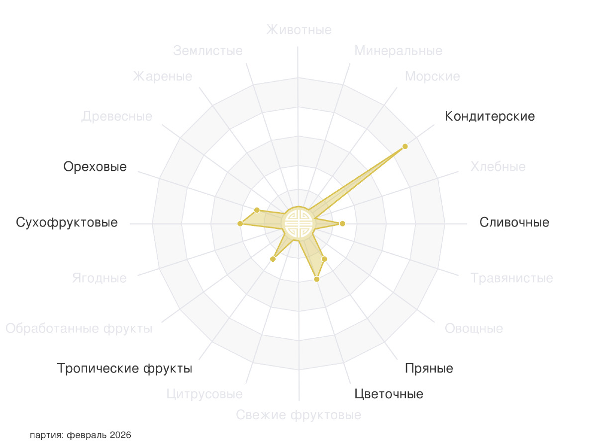 Послевкусие сохраняет ореховую тему с нотками какао, добавляя шелковистость и проявляя пушистость по тактильности. Шлейф аромата сладкий и насыщенный, где преобладают ореховые скорлупки, свежий виноград, дополненные луговыми медовыми цветами.