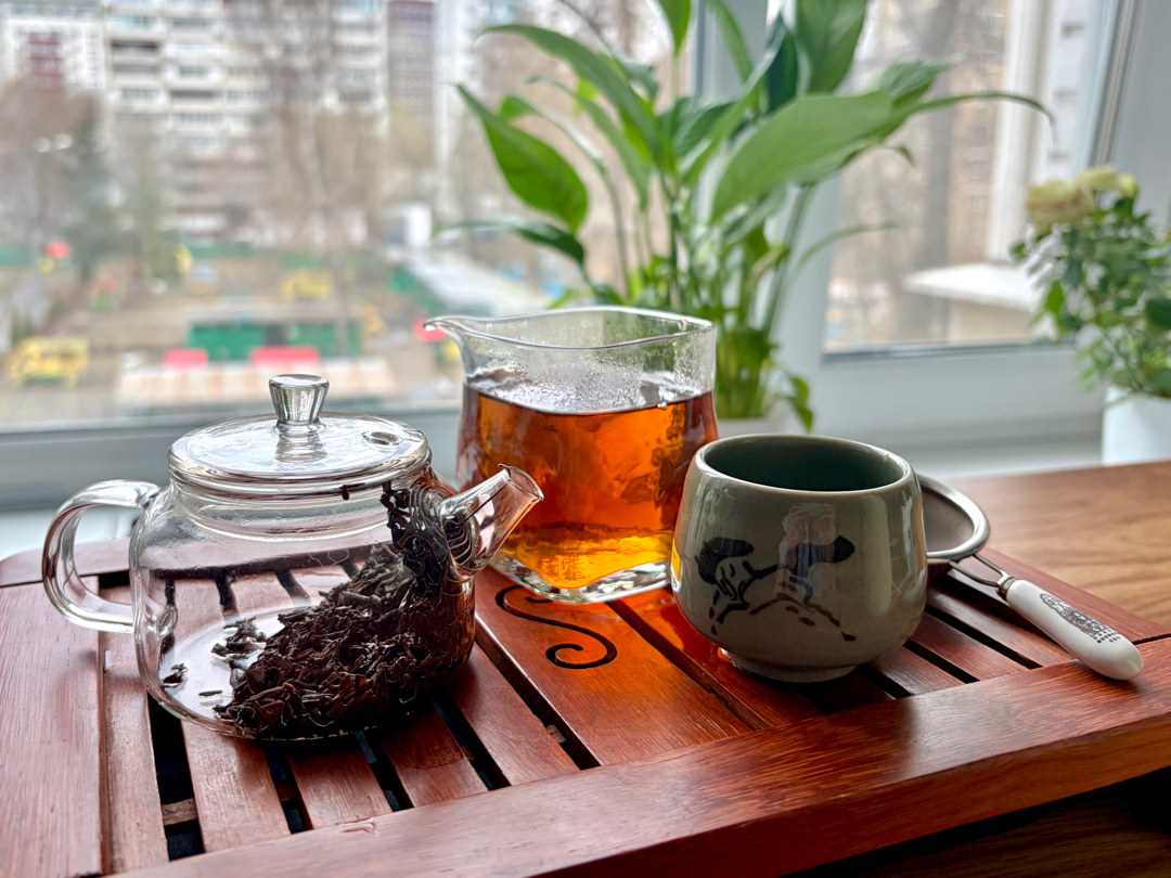 Приятный во всех отношениях чай. Увидев чай воочию, сразу понимаешь, что проливы не тот случай и лучшим решением будет большой чайник для настаивания "дедовским" способом. Заваривал я его по простому, в большом стеклянном чайнике 600-700 мл. Который в целом похож больше на огромный чахай! 3.3 грамма и кипяток. Аромат интересный и неожиданный, это не Цзинь Цзюнь Мэй, и не Дянь Хун, и уж точно не Сяо Чжун, тут своя атмосфера, пряный подлесок, грибы, пахлава, арахис, местами даже напомнил мне выдержанные белые! Из пустого чахая выдал немного кожи и хвойной смолы (мебели), но всё же основной аромат тут ореховый (арахис, лесной орех) и чуточку от варёной сгущёнки или молочной карамели (из жжёного сахара). Во вкусе по началу напомнил Хэй Ча, но быстро перестроился в необычный красный, скорее похожий на вьетнамский но не такой яркий, тут и лесная листва с хвоей и трухлявые пни с грибницей (ХэйЧа) и щербет из каких-то орехов, но очень ненавязчиво. В целом чай мягкий, хотя и грамм не так много, получился согревающий, заземляющий и освежающий!