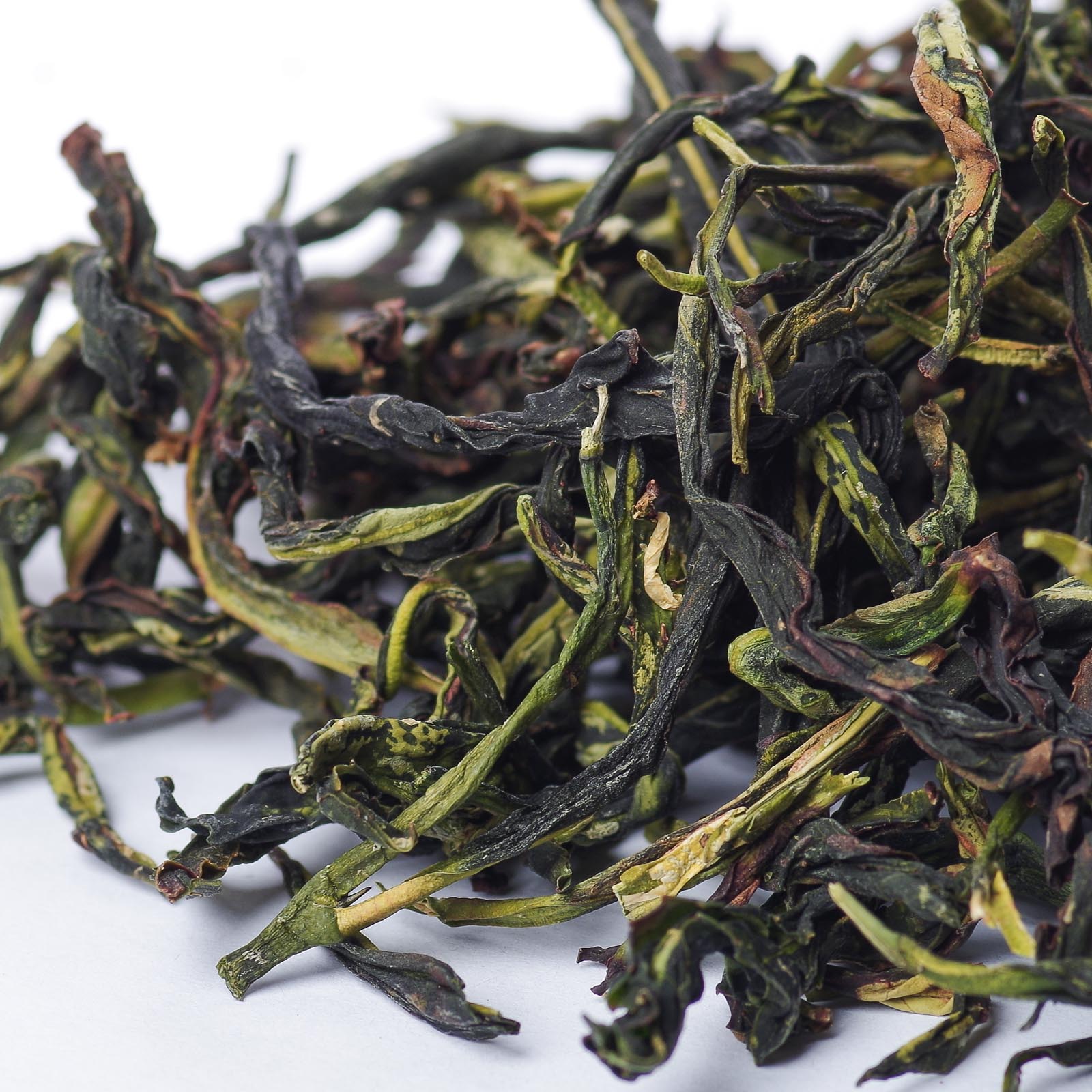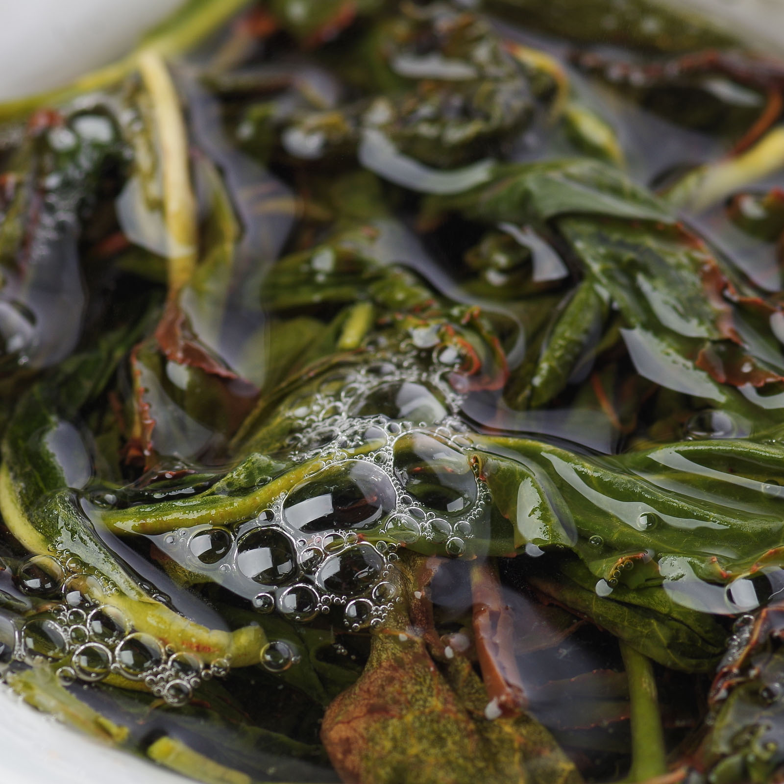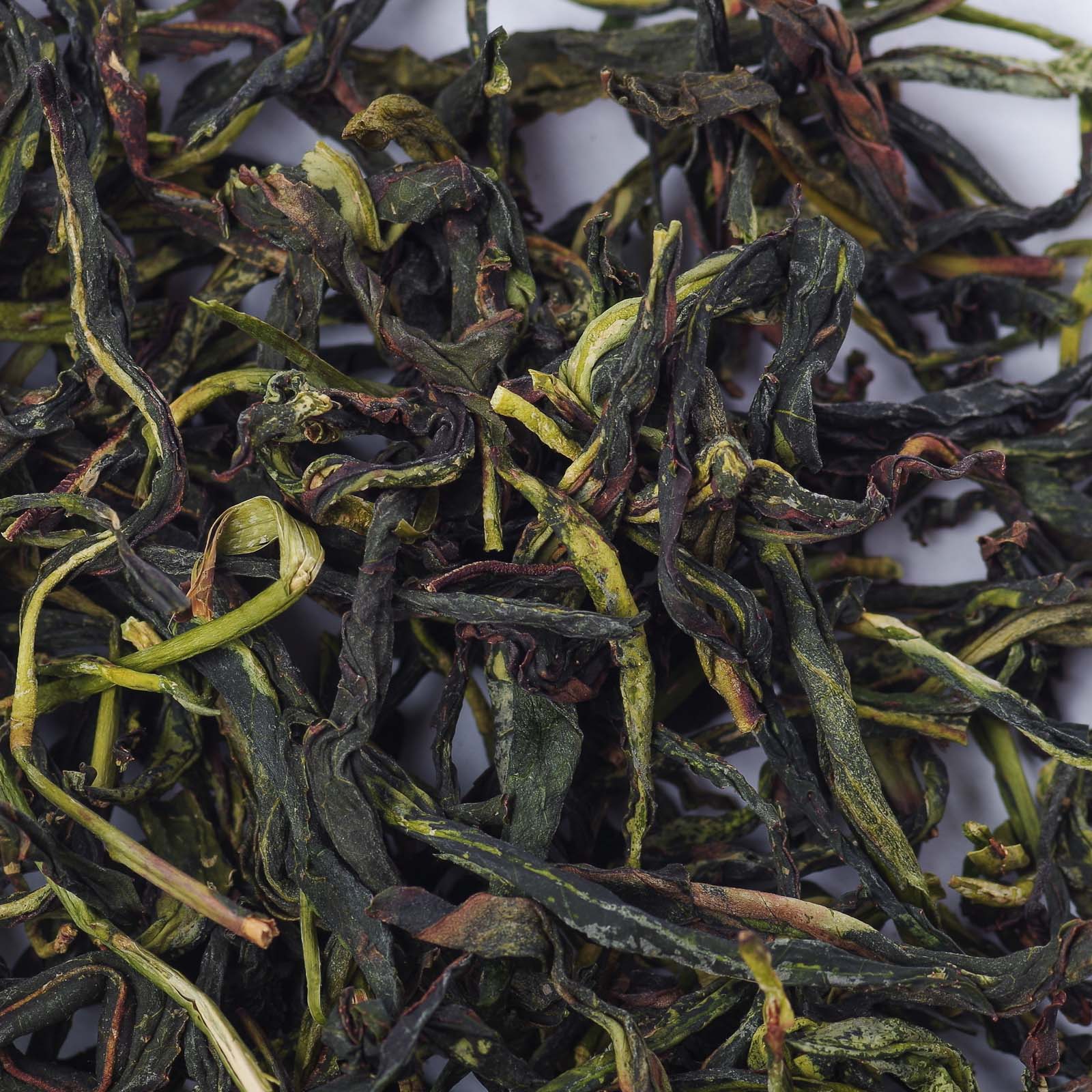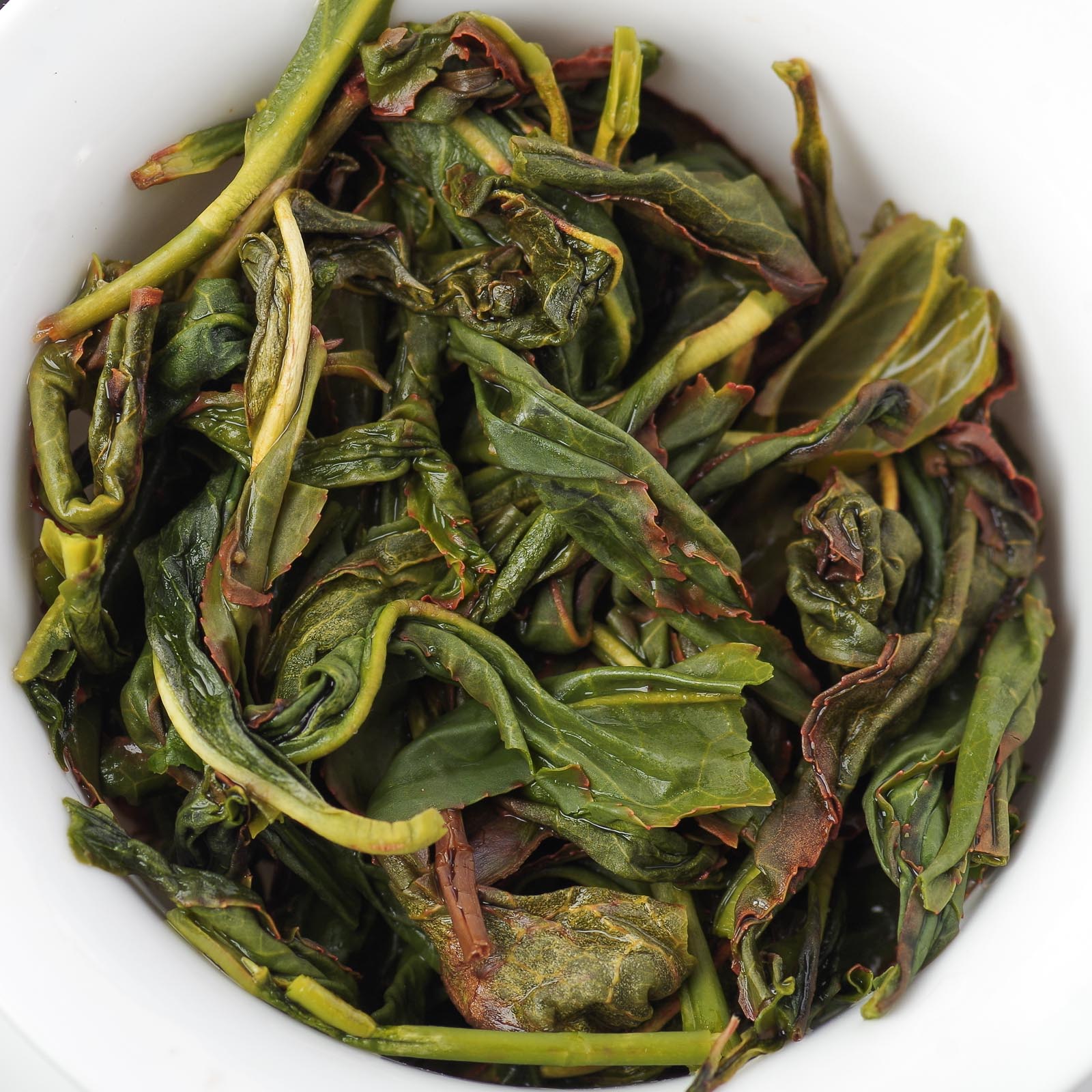 Спитой лист вытянутый и остроконечный (культивар 大乌叶品种) преимущественно цельный, с бордовыми участками на сгибах и с красивой бордовой окисленной кромкой.