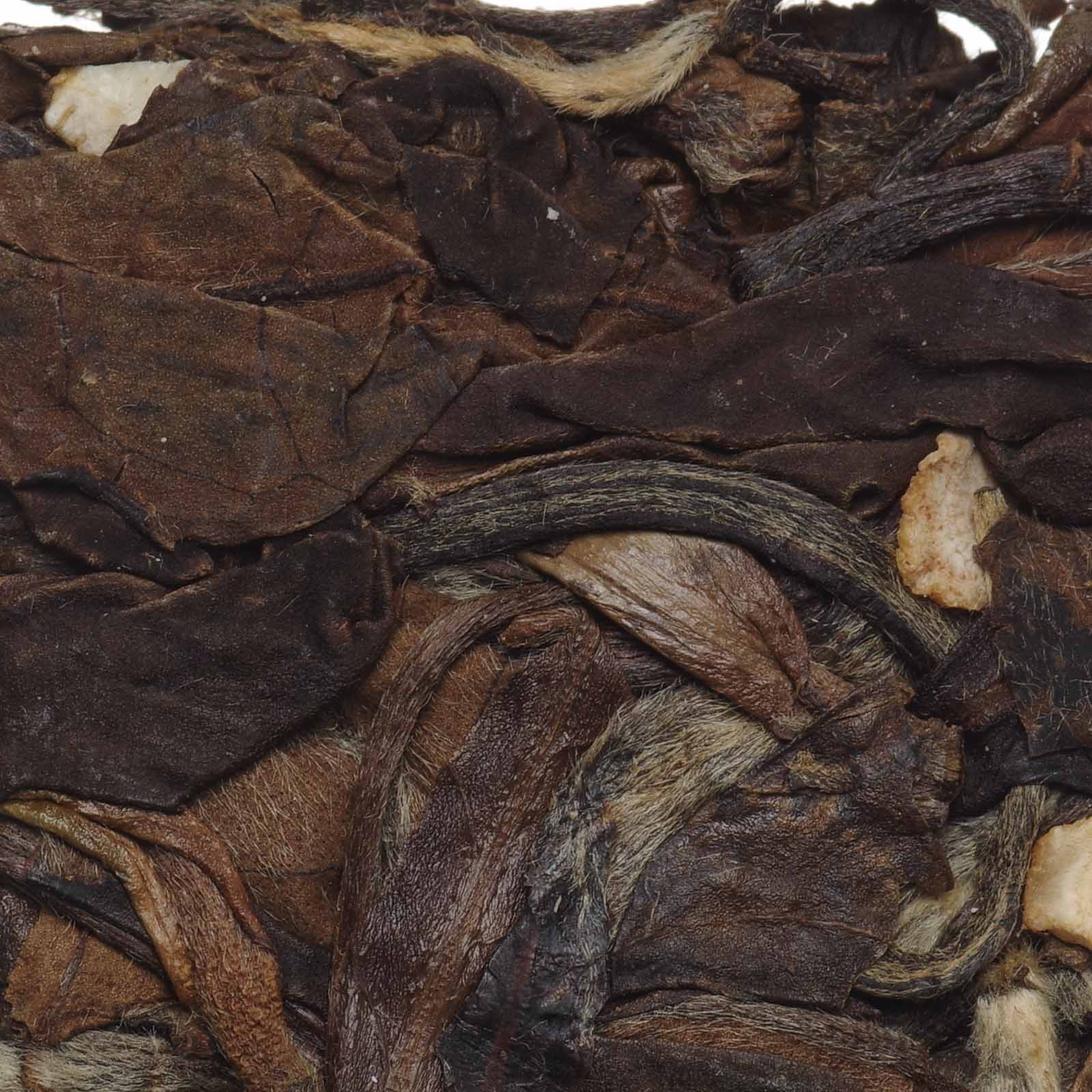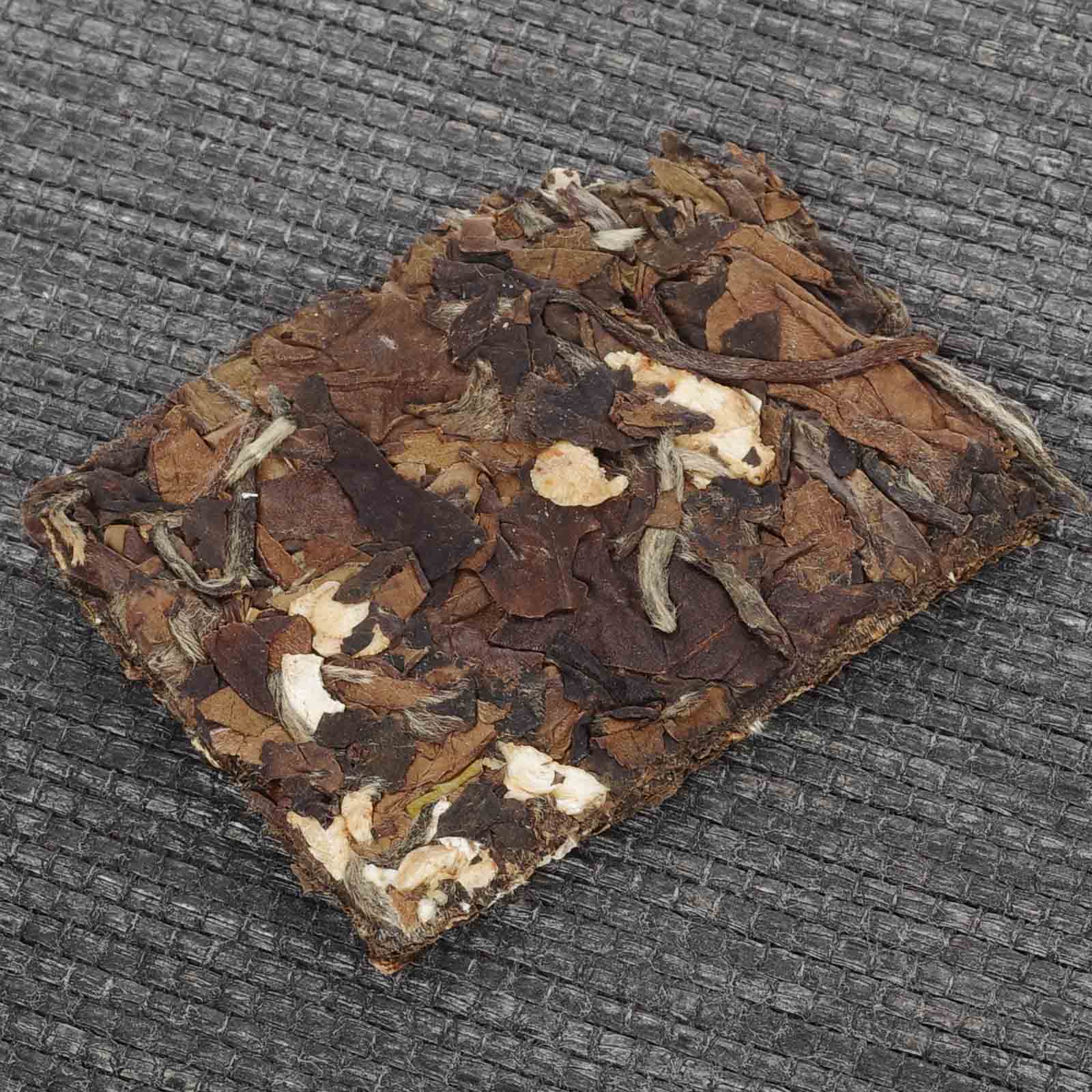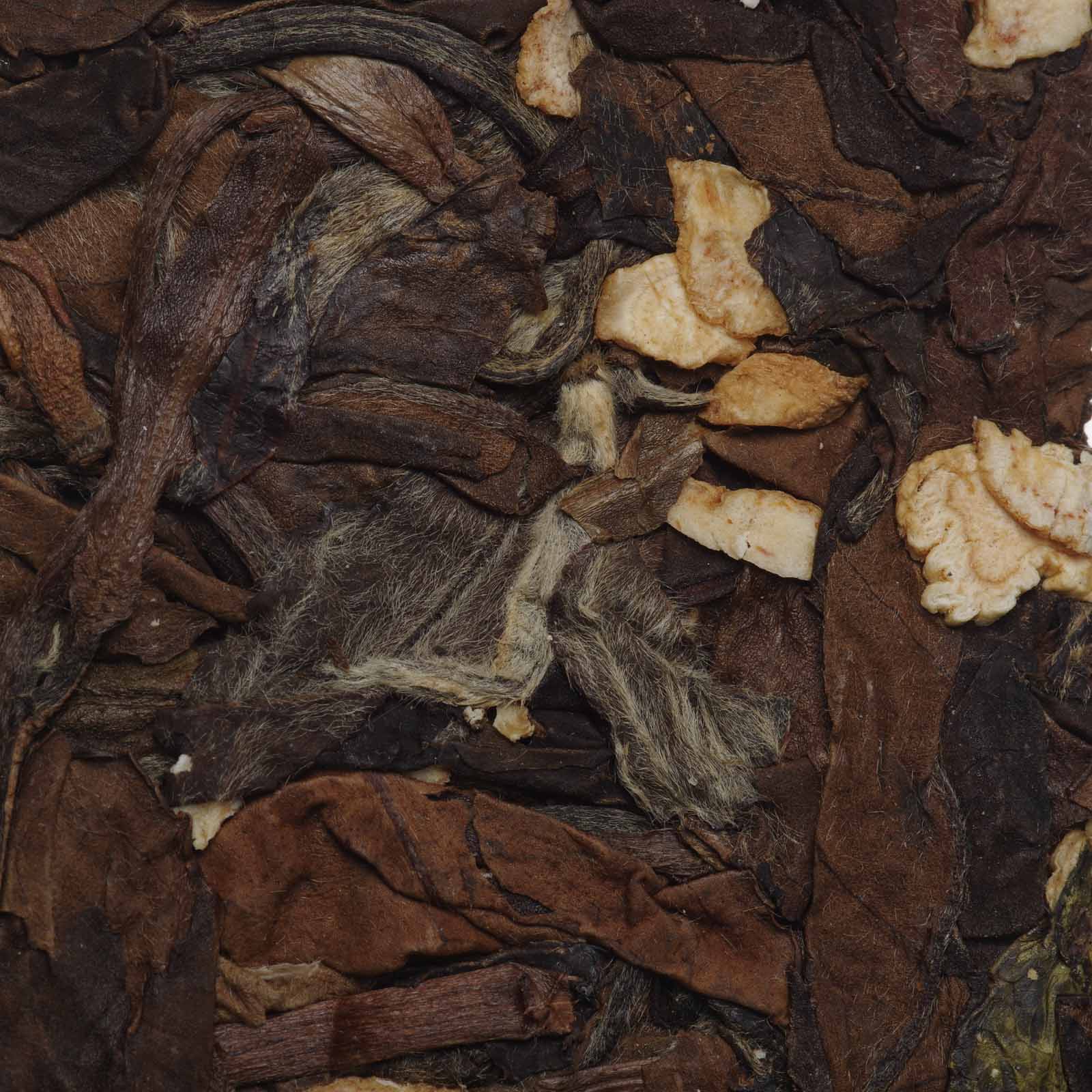 Аромат сухого листа сочетает пряные корнеплодные оттенки с нотами подлеска и мха. В прогретой посуде усиливаются характерные нюансы корня женьшеня, при этом белый чай почти не ощущается, на фоне проступает легкая горчинка тертого шоколада. Заваривание меняет баланс: белый чай выходит на первый план, добавляя компотные фруктовые оттенки с сочным теплым яблоком. На поздних проливах женьшень вновь становится заметным, возвращая глубину и сухость корня. Вкус плотный, с легкой кислинкой и песочной текстурой, при этом женьшень не перекрывает характер белого чая. Послевкусие оставляет ощущение сухой древесины и натуральной сладости женьшеня. В шлейфе проявляются мягкие ноты яблочного компота, сахара и меда.