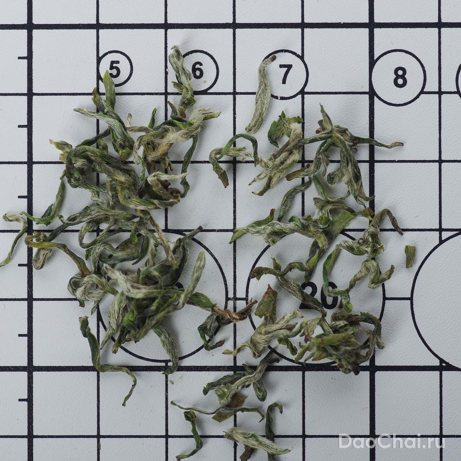 В сухом виде спирали легкой скрутки. Бело-зеленые с обилием ворса не более 1 см в длину.